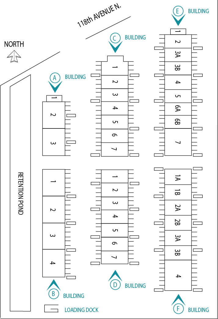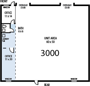 Florida Workshop/Warehouse Center is made up of thirty-seven workshop/warehouse units: one 600 SF, twenty-five 1800 SF (30' x 60'), one 2400 SF, six 3000 SF (60' x 50'), and two 3600 SF (60' x 60') units. These units are constructed of concrete block with an insulated metal roof. The ceiling is 16'6" high at its lowest point. All 1800 SF units and the 2400 SF unit have two overhead 10' x 12' roll-up door. The 3000 SF units have two 12' x 12' overhead roll-up doors. The 3600 SF units each have four 10' x 12' overhead roll-up doors. The 600 SF unit has only one 10' x 12' overhead roll-up door. Each unit has two pedestrian doors except for the 600 SF unit which only has one. All driveways and parking areas are paved with concrete. Each workshop/warehouse unit features at least one finished office. Our larger 3000 SF and 3600 SF floor plans have additional finished space available in some units. All units have a bathroom, a laundry tub sink, electrical outlets around the inside perimeter wall of the shop, skylights, a roof ventilator, and a sealed and coated concrete floor. Some units have been upgraded with 3-phase electric panels, central HVAC, and additional build-out. For more information please Contact Us.